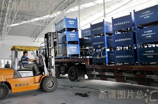 2011年7月18日,工人在新疆国际会展中心装卸布置材料。当日,首批500套展位布置材料送至新疆国际会展中心。作为首届中国—亚欧博览会的主会场,新疆国际会展中心将设置6个主展厅,1个小展厅,1个轻型展厅及16个会议室,提供约8000个室外展位,可充分满足国内外参展客商的需要。