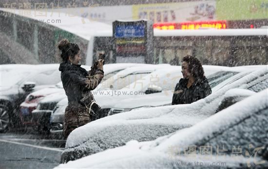 2013年11月8日,在乌鲁木齐市大西门,两位市民在大雪中拍照留影。