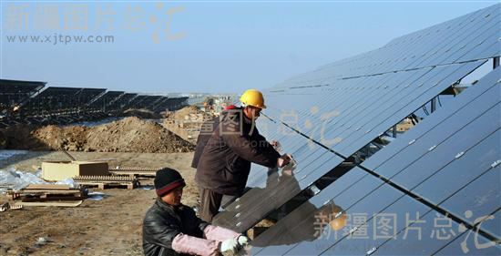 2013年11月12日,由汉能控股集团投资2.5亿元,新疆福海汉能一期20兆瓦并网光伏发电基地项目建设工地上,工人们在安装薄膜太阳板。自9月16日开工建设以来,目前4兆瓦建设已经进入尾声,预计12月10日可以并网发电。