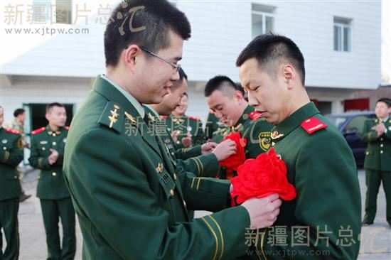 2013年11月13日,武警边防部队乌鲁木齐指挥学校的警官在为退伍老兵佩戴大红花。