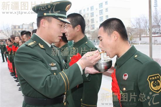 2013年11月14日,武警新疆边防总队吉木乃边检站警官为退伍老兵端上了送行饺子。