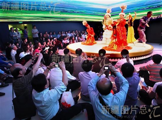 新疆馆的舞蹈演员跳起了欢快的民族舞蹈,吸引了游客观赏。
