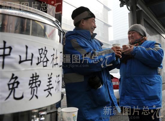 2012年2月14日,环卫工人在乌鲁木齐市中山路车站喝着免费提供的姜汤取暖。