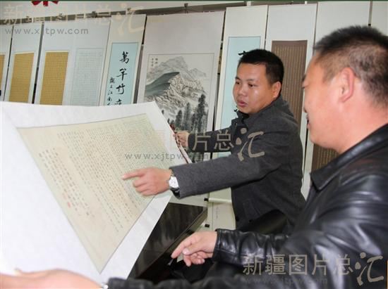 2013年11月17日,参观者在欣赏书法作品。近日,和布克赛尔蒙古自治县举办书画、摄影作品联展。展出反映当地人文历史、地域文化的书法、绘画、摄影作品120余幅。这些作品都出自自治区党史研究室殷秉旺、魏永龙与和布克赛尔蒙古自治县书法家协会会员杜崇庆三人之手。