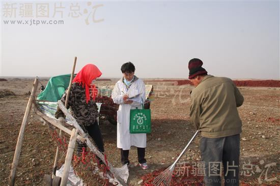 2013年11月17日,新疆生产建设兵团第二师疾病控制中心医务人员,在位于霍拉山下的21团,为正在晾晒辣椒的职工进行国家脑血管病流行病学专项问卷调查。