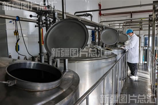 2023年3月10日,工人在新疆伊哈牧场乳业有限责任公司生产车间查看鲜奶输送情况。