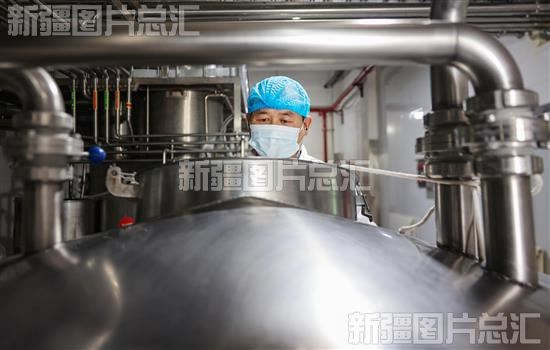 2023年3月10日,工人在新疆伊哈牧场乳业有限责任公司浓缩车间查看浓缩暂存罐运行情况。