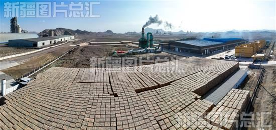 2023年3月10日,新疆博乐市鄂港口新型建材有限公司生产的标准砖摆放在厂区(无人机拍摄)。