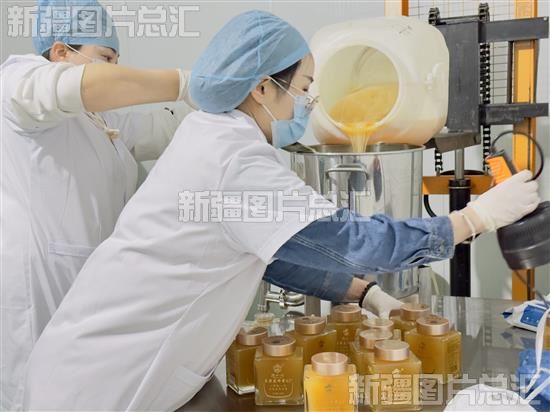 2023年3月28日,位于温宿县温宿镇金华新村的蜂蜜加工生产车间里,工人正在有序进行蜂蜜的无菌化灌装工作。