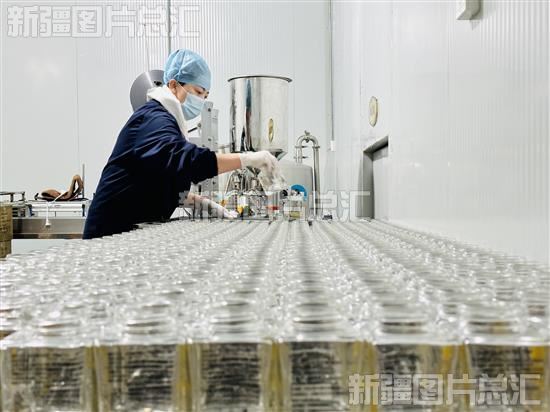 2023年3月28日,新疆蜜姐黑蜂有限公司员工在生产车间灌装蜂蜜。??