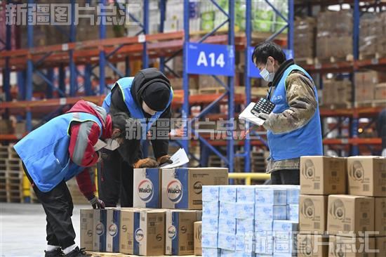 2023年2月25日,在乌鲁木齐国际陆港区铁路口岸快件中心天猫超市新疆城市仓,工作人员正在根据订单配货。
