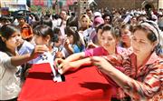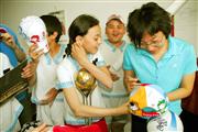 女足运动员孙雯为新疆小演员签名